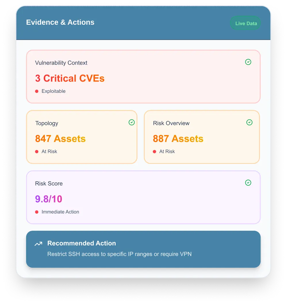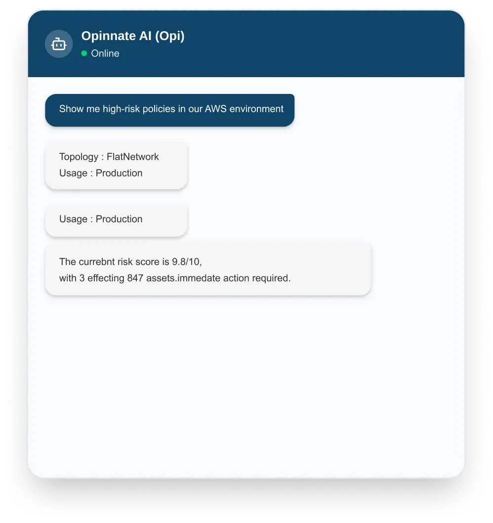 Opi (the AI copilot) helps teams ask questions, understand impact, and prioritize actions with evidence — using risk and asset context built into the platform.