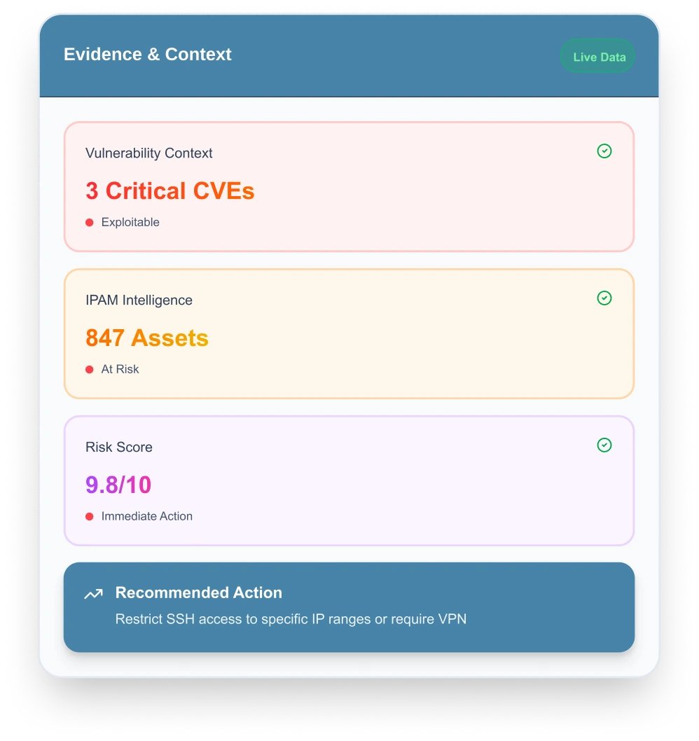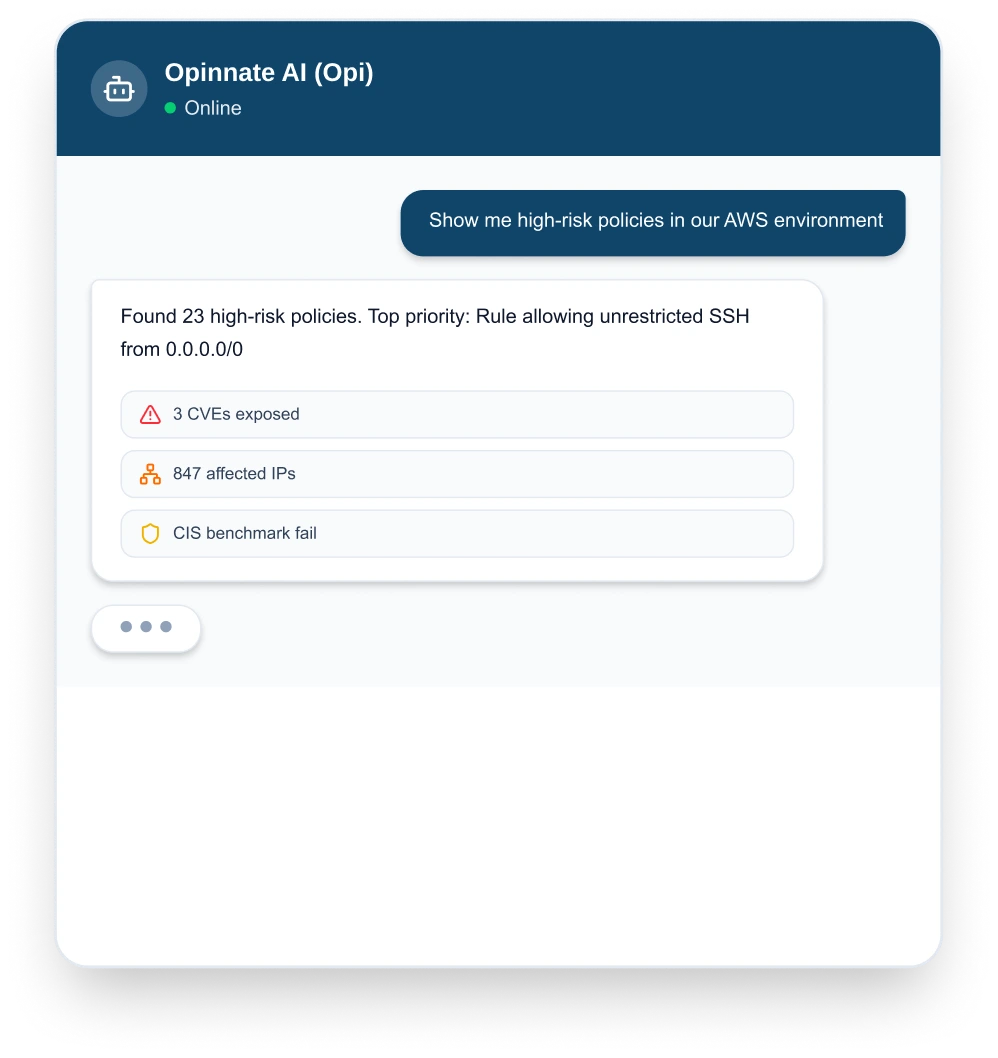 Opi (the AI copilot) helps teams ask questions, understand impact, and prioritize actions with evidence — using risk and asset context built into the platform.